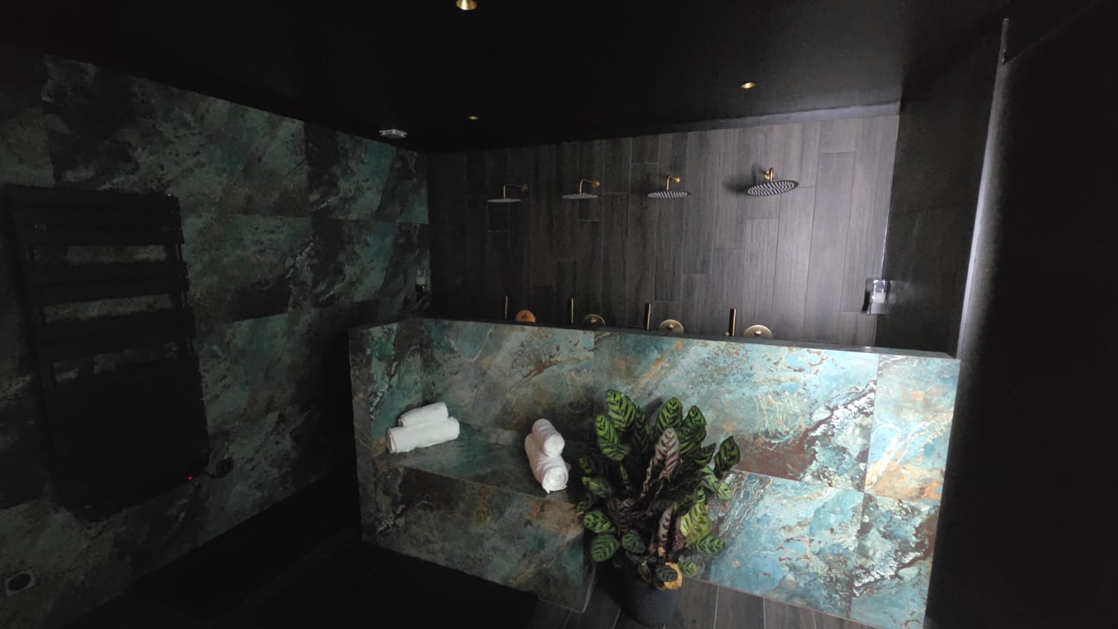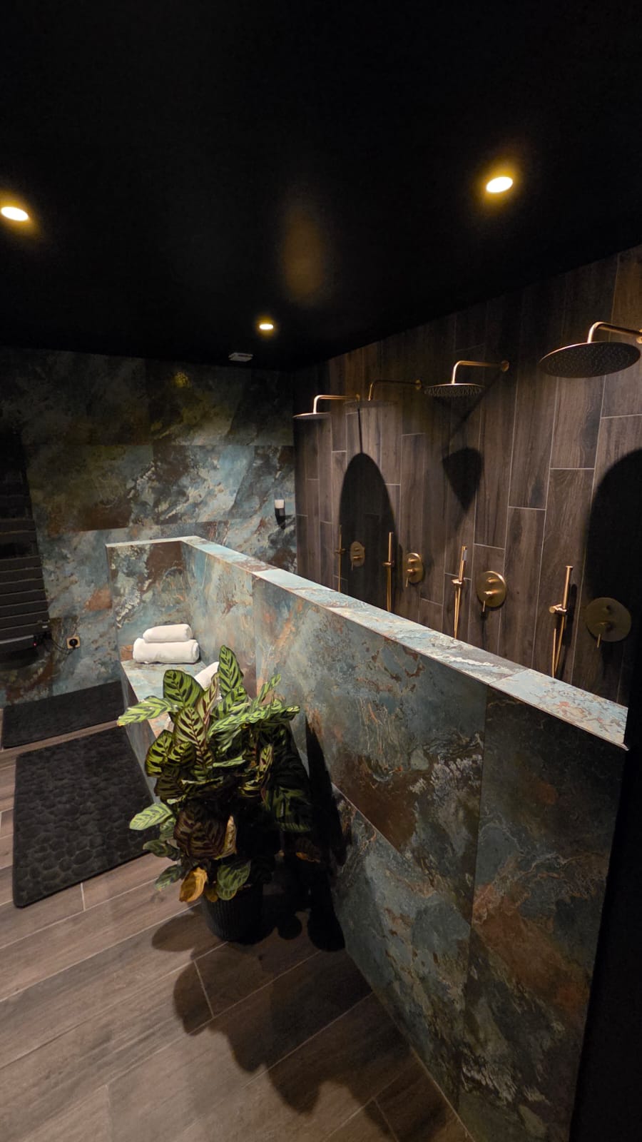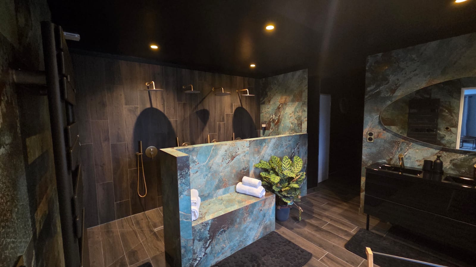 Voici l’écrin de notre salle de bain, un lieu où le temps s’arrête. Entre le charme minéral des murs et le confort de nos douches spacieuses, préparez vous à vivre un moment de pure détente et d’intimité.