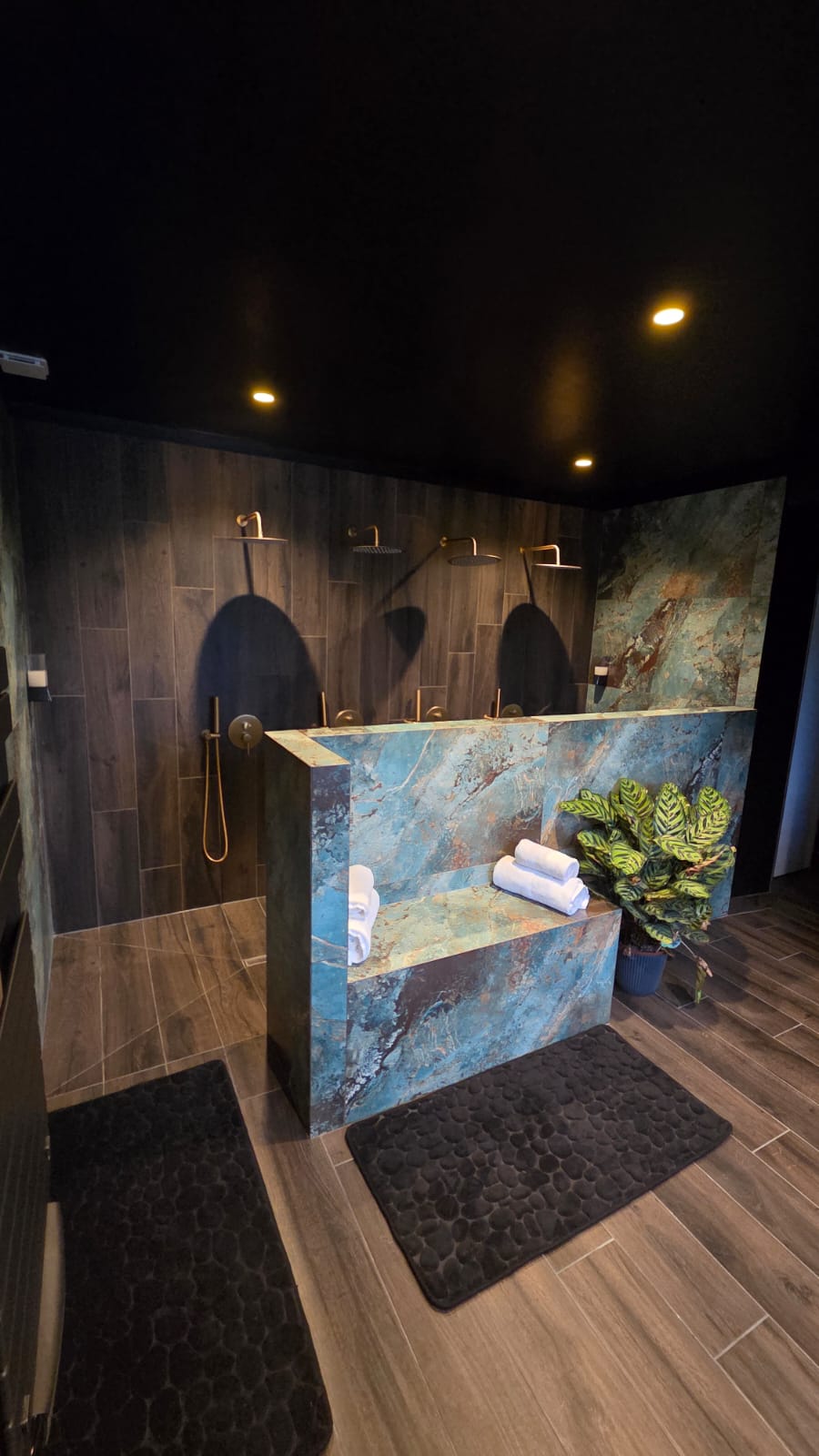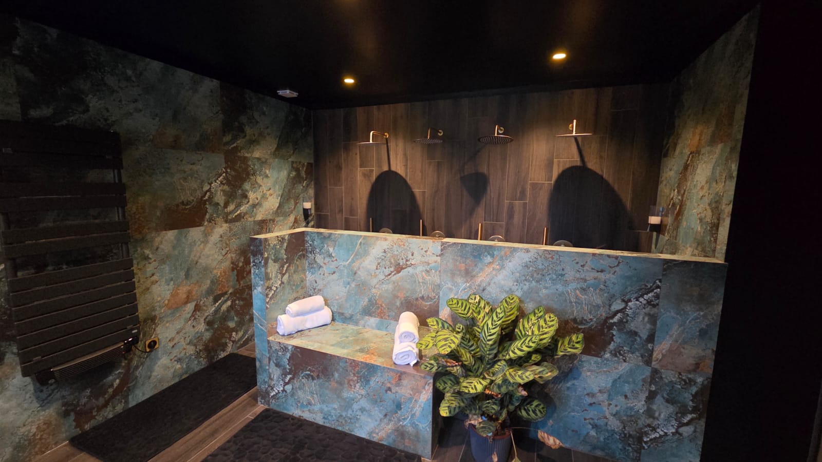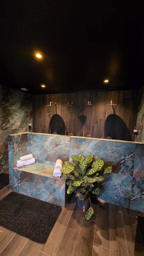 Voici l’écrin de notre salle de bain, un lieu où le temps s’arrête. Entre le charme minéral des murs et le confort de nos douches spacieuses, préparez vous à vivre un moment de pure détente et d’intimité.