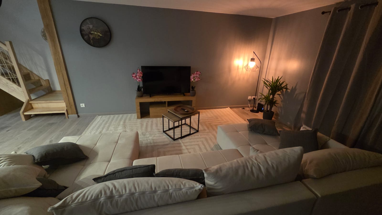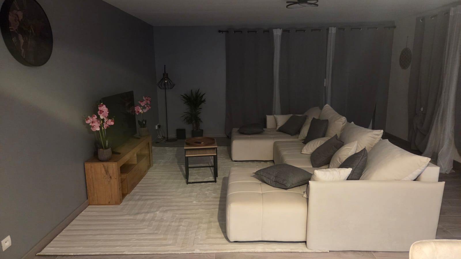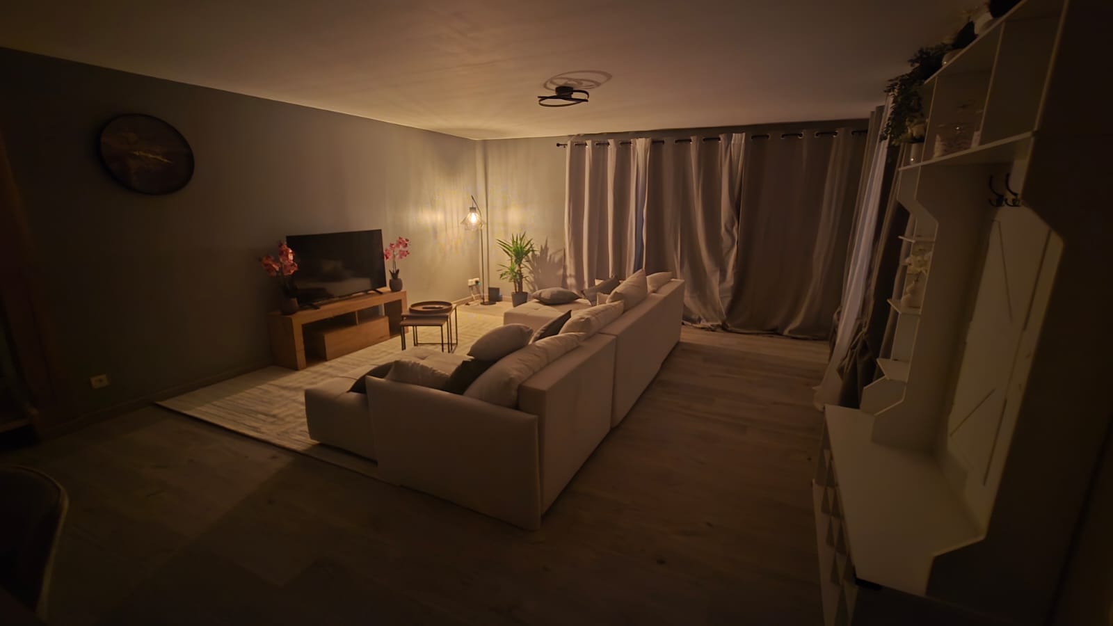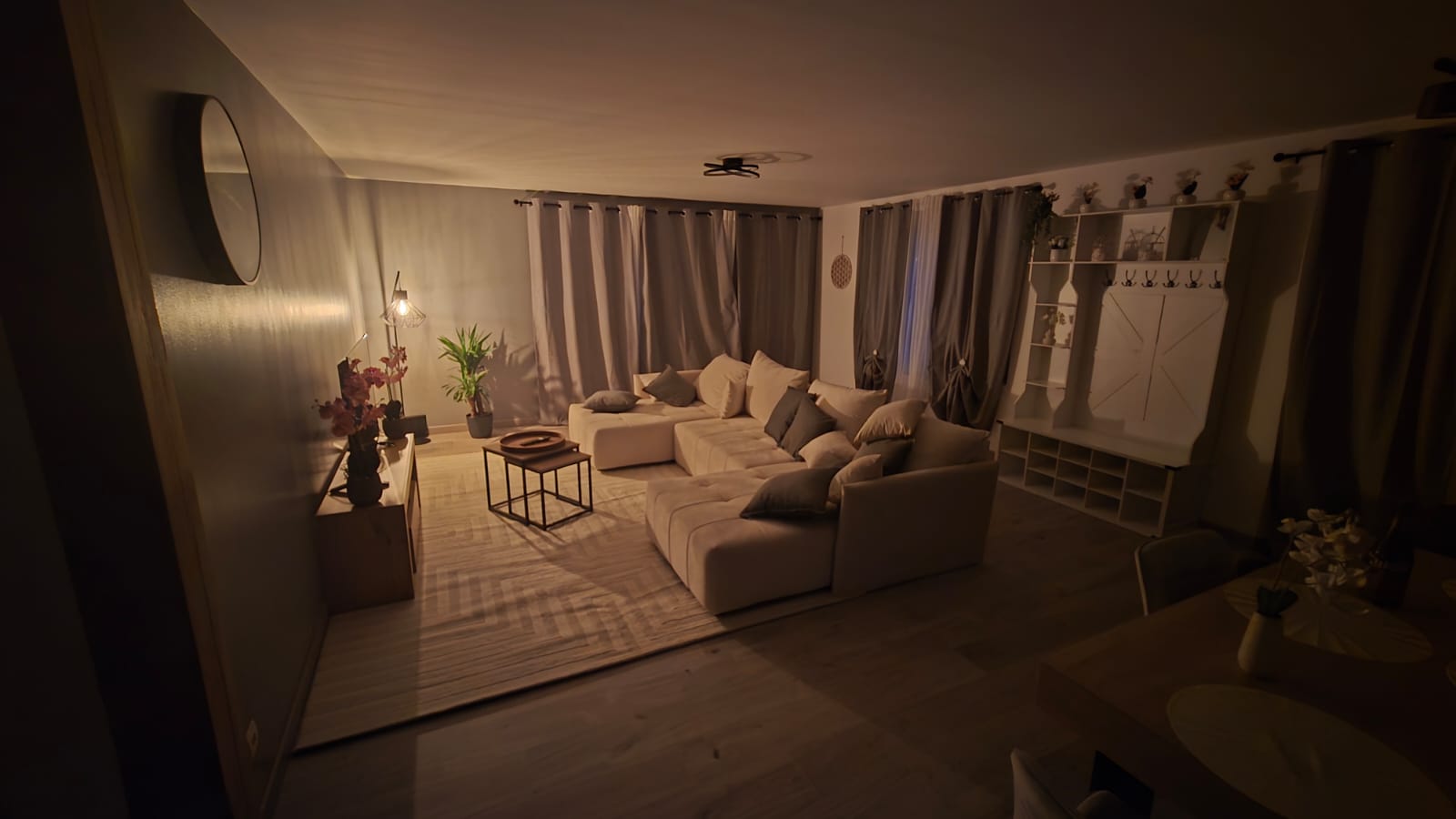 Laissez vous enveloppez par le confort de ce grand canapé moelleux, le tout baigné dans une lumière tamisée pour une ambiance ultra cocooning.