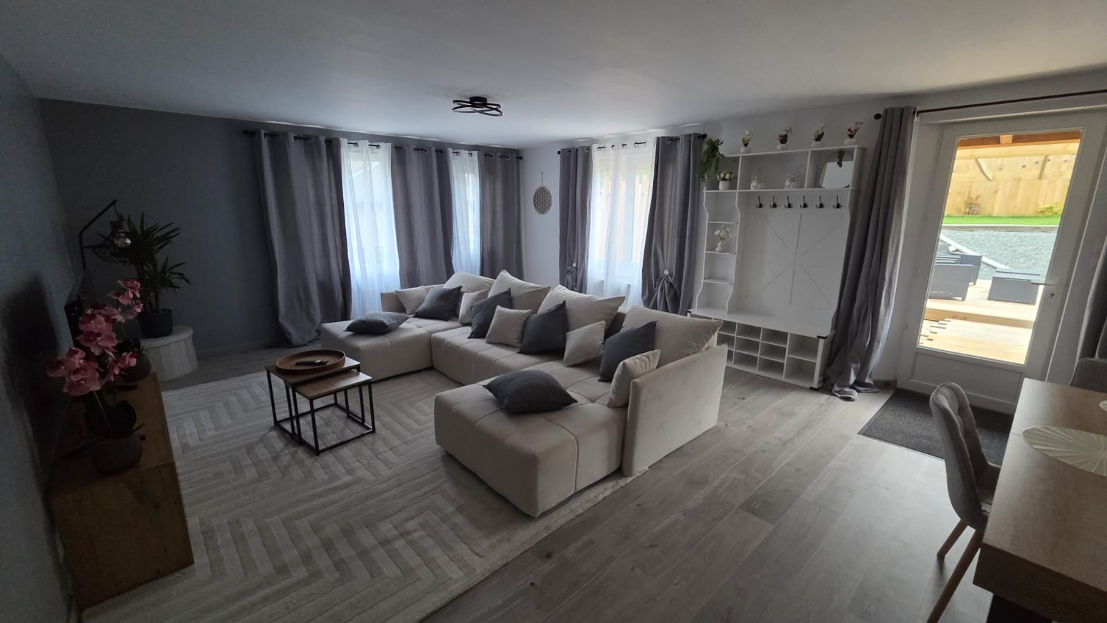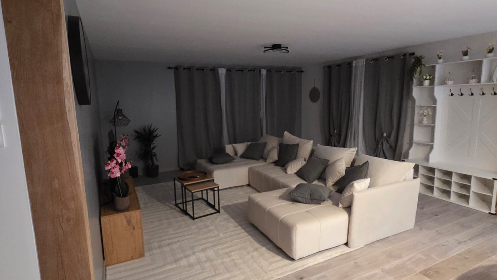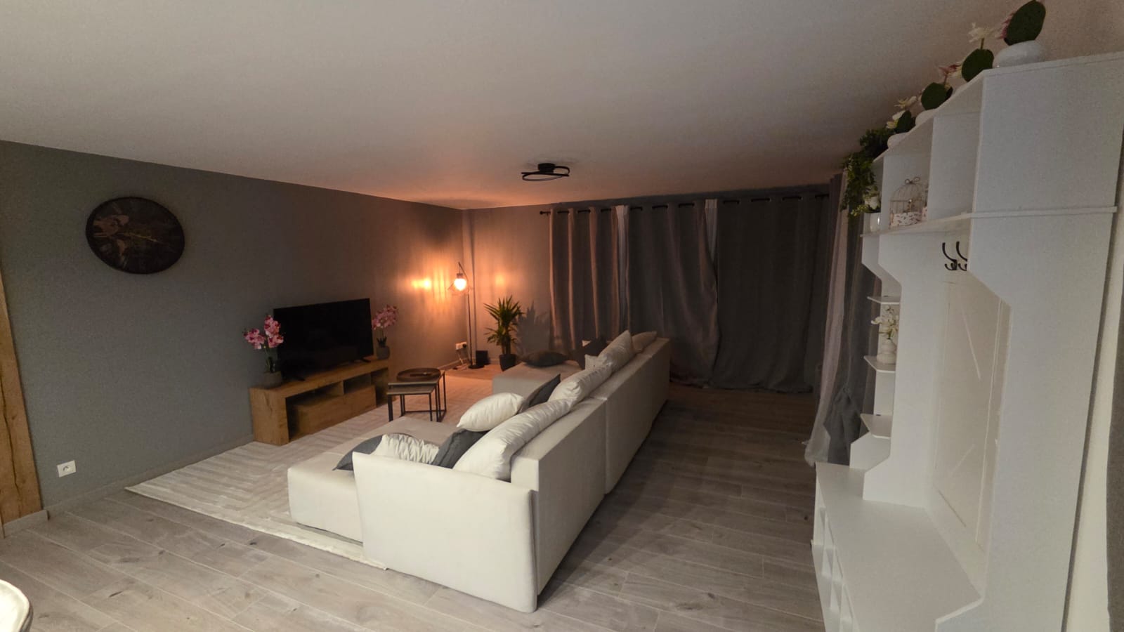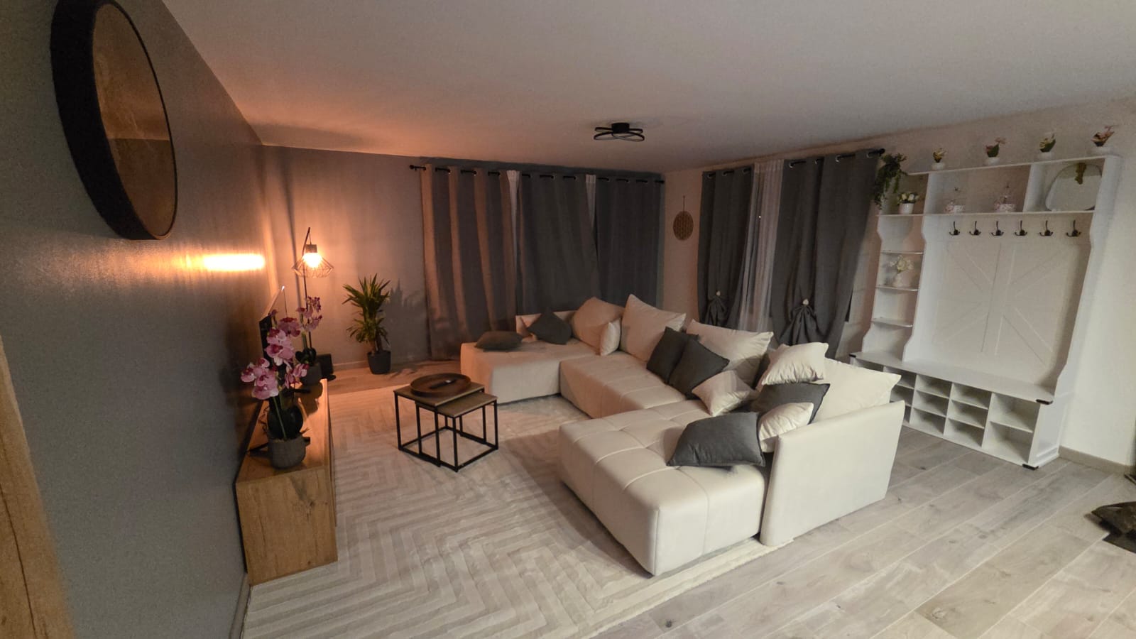 Laissez vous enveloppez par le confort de ce grand canapé moelleux, le tout baigné dans une lumière tamisée pour une ambiance ultra cocooning.