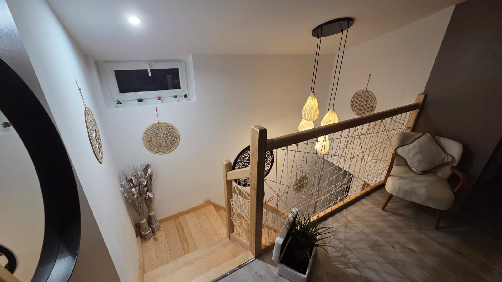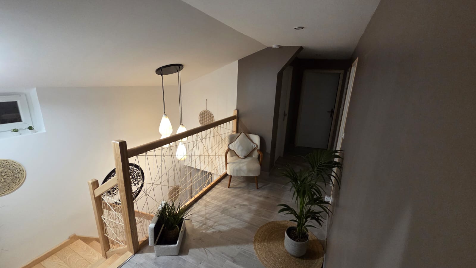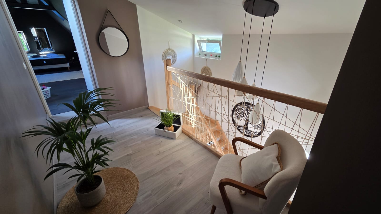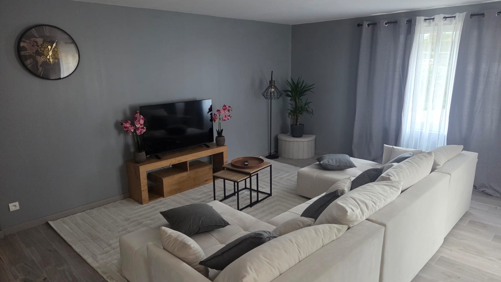 Laissez vous enveloppez par le confort de ce grand canapé moelleux, le tout baigné dans une lumière tamisée pour une ambiance ultra cocooning.